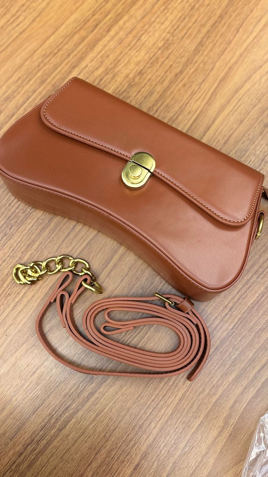Seu design alongado cria uma silhueta elegante e atual, enquanto o material liso em tom caramelo entrega aquele toque de leveza e classe que combina com absolutamente tudo. O fecho frontal dourado, com formato arredondado e acabamento brilhante, é o grande protagonista — discreto, mas marcante, dando à bolsa uma personalidade contemporânea irresistível.